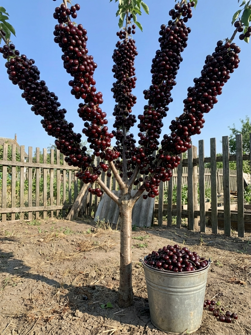 Звичайна черешня дає плоди лише на кінчиках гілок, залишаючи більшість гілки порожньою. Китайська низькоросла — зовсім інша. Тут кожен сантиметр гілки, від основи до кінчика, щільно вкритий великими ягодами. Не кілька кетягів — а суцільний, нерозривний ряд плодів. Саме тому дерево виглядає так вражаюче: гілки буквально прогинаються під вагою врожаю.